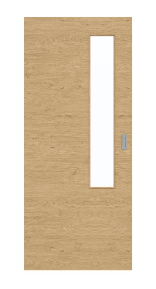 Wąskie przeszklenie po stronie zamka nadaje skrzydłu drzwiowemu indywidualny wygląd. Ponadto powierzchnia przepuszczająca światło zapewnia jasne wnętrza. Te nowoczesne drzwi przesuwne charakteryzują się naturalnymi odcieniami brązu. Ciekawym detalem jest poziome ułożenie dekoru dębowego. Urozmaicone usłojenia i dyskretne sęki charakteryzują tę imitację drewna. Materiał powierzchniowy wykonany z CPL jest wytrzymały i odporny na zarysowania.
