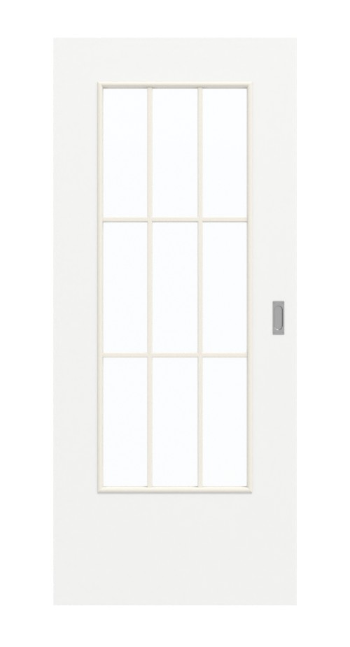 Jasną atmosferę we wnętrzu zapewnia duży otwór wpuszczony w środkowej części skrzydła drzwi. Jest podzielony na dziewięć równych pól za pomocą eleganckiej ramy z szprosami. Te drzwi przesuwne wyróżniają się dyskretną elegancją dzięki białej powierzchni . Odcień Edelweiß idealnie komponuje się z każdym stylem wnętrza. Powierzchnia z płyty HPL wykazuje się wyjątkową odpornością na obciążenia mechaniczne.