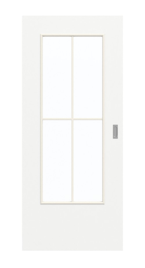 Szklany wstawka pośrodku skrzydła drzwiowego zapewnia jasny i przyjazny klimat wnętrza. Dzięki pięknej ramie z szprosami otwór okienny jest optycznie podzielony na cztery części. Te drzwi przesuwne wyróżniają się dyskretną elegancją dzięki białej powierzchni . Odcień Edelweiß pasuje do każdego stylu wnętrza. Powierzchnia z płyty HPL jest odporna na zarysowania i ścieranie.