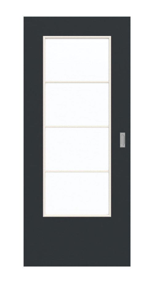Jasną atmosferę we wnętrzu zapewnia duży otwór wpuszczony w środkowej części skrzydła drzwi. Szkło jest podkreślone pionowymi szprosami, nadając drzwiom nowoczesny wygląd. Dzięki czarnej powierzchni te drzwi przesuwne z pewnością przyciągają wzrok. Ten ciemny odcień tworzy spokojną atmosferę. Wytrzymała powierzchnia z płyty HPL jest odporna na działanie światła i ciepła.