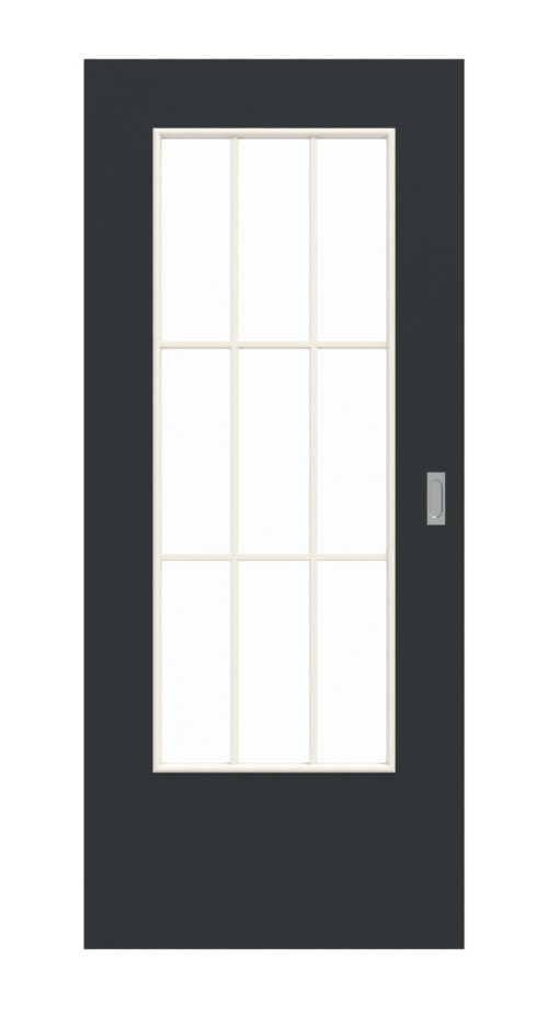 Szklany wstawka pośrodku skrzydła drzwiowego zapewnia jasny i przyjazny klimat wnętrza. Delikatna ramka z prętów dzieli duży prostokąt na dziewięć mniejszych. Czarne drzwi przesuwne charakteryzują się nowoczesnym urokiem. Odcień „czarny wulkaniczny” wygląda elegancko. Powierzchnia z płyty HPL wykazuje się wyjątkową odpornością na obciążenia mechaniczne.