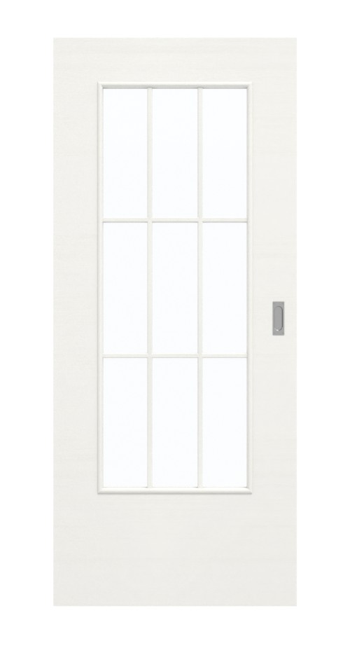 Dzięki wycięciu na szybę pośrodku skrzydła drzwiowego możesz cieszyć się jasnymi wnętrzami. Proste szprosy dzielą je na dziewięć równych pól. Drzwi przesuwne z białym dekorem drewna zachwycają swoim nowoczesnym wyglądem. Poziomo przez skrzydło drzwiowe przebiegają filigranowe usłojenia. Powstaje spokojny obraz całości. Światło, ciepło i ścieranie mechaniczne nie mają większego wpływu na wytrzymałą warstwę wierzchnią z HPL.