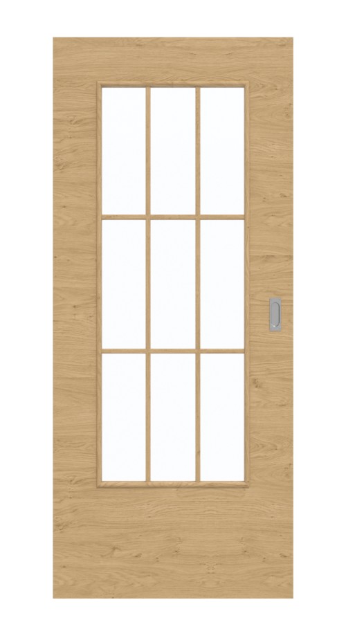 Dzięki dużemu przeszkleniu pośrodku skrzydła drzwi do pomieszczeń wpada mnóstwo światła. Delikatne pędy dzielą go na dziewięć równych segmentów. Brązowe drzwi przesuwne zachwycają swoim nowoczesnym wyglądem. Dzięki poprzecznemu wzorowi imitującemu drewno dębowe drzwi przyciągają wzrok. Dynamiczne usłojenia i subtelne sęki przyciągają wzrok. Powierzchnia z płyty HPL jest odporna na działanie światła i niezwykle wytrzymała.