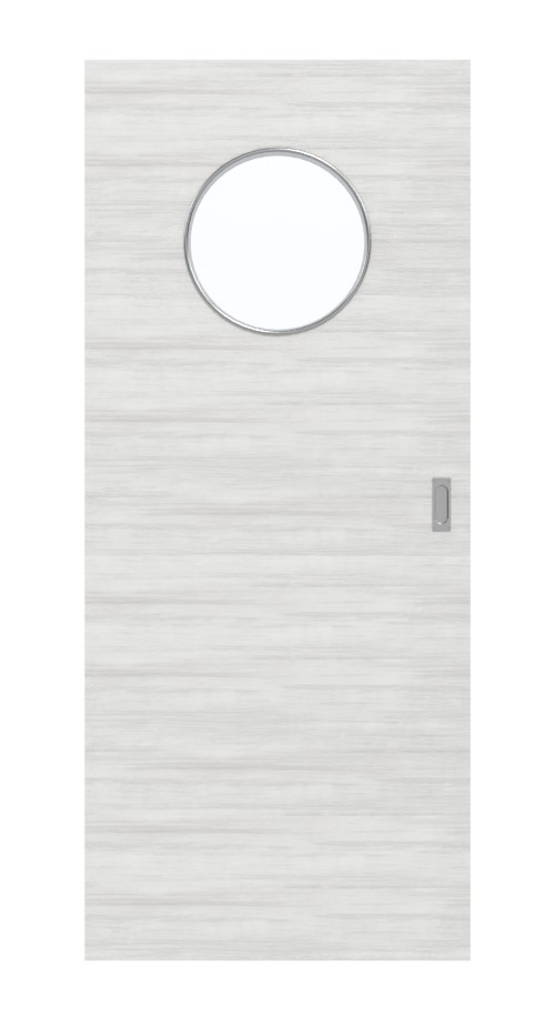 Górną część skrzydła drzwi zdobi duże, zaokrąglone wycięcie na szybę, przez które do pomieszczeń wpada światło, nadając im przyjazny charakter. Drzwi przesuwne w szarym kolorze imitującym drewno zachwycają modnym designem. Delikatne usłojenia zapewniają urozmaicenie. Dekor biegnie poziomo przez skrzydłoa drzwiowe i nadaje modelowi niepowtarzalny charakter. Powierzchnia HPL jest odporna na zarysowania i ścieranie.