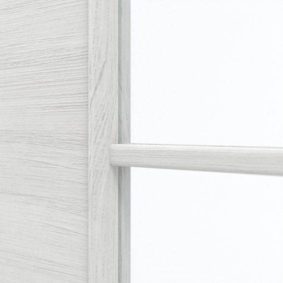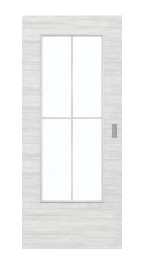 Dzięki dużemu przeszkleniu pośrodku skrzydła drzwi do pomieszczeń wpada mnóstwo światła. Elegancka rama z poprzeczkami nadaje mu subtelny akcent. Te drzwi przesuwne w szarym wykończeniu imitującym drewno charakteryzują się modnym, eleganckim wyglądem. Imitacja drewna zyskuje żywy wygląd dzięki delikatnym słojom. Cechą charakterystyczną jest poziome ułożenie wzoru. Warstwa wierzchnia wykonana z HPL jest bardzo trwała i odporna na zabrudzenia.