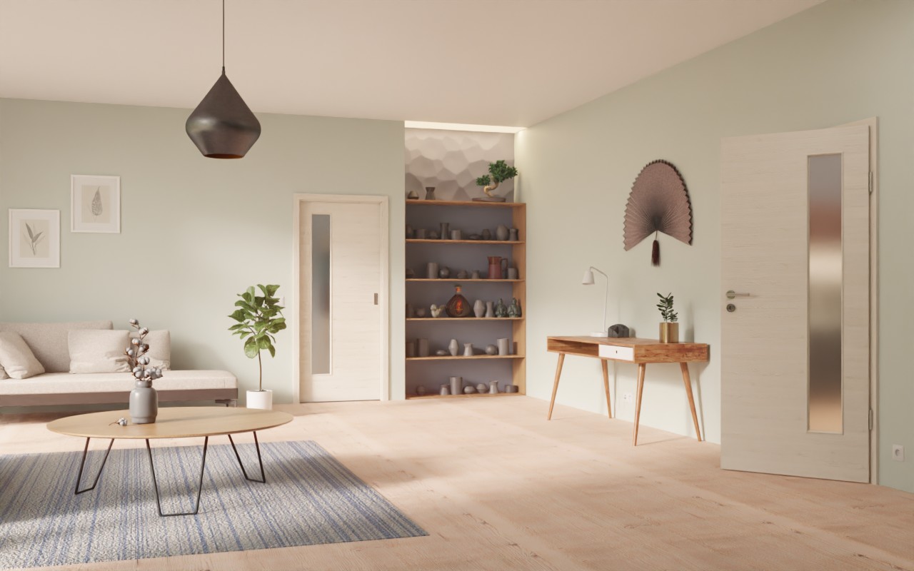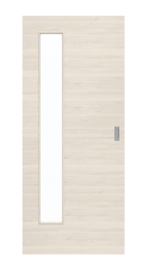 Przyjemną atmosferę we wnętrzu zapewnia wąskie wycięcie na szybę, umieszczone po stronie zawiasów skrzydła drzwiowego. Delikatne usłojenia zdobią skrzydło drzwiowe z jasnym dekorem drewna. Design jest ułożony poziomo. Powierzchnia wykonana z HPL jest łatwa w pielęgnacji i odporna na zabrudzenia.
