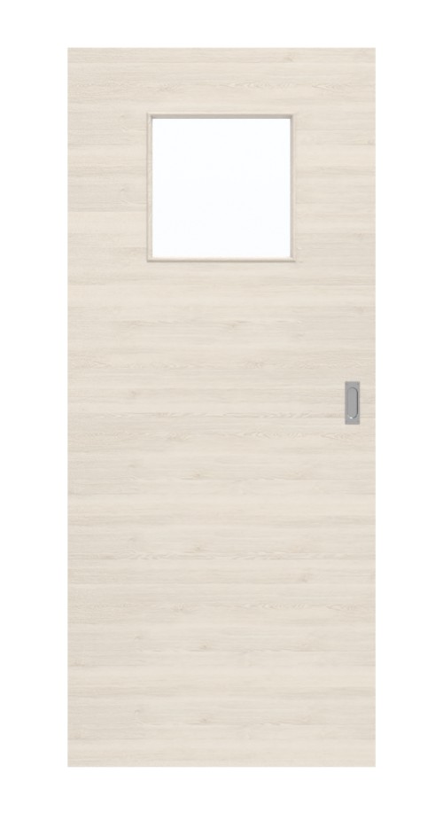 Dzięki kwadratowemu wycięciu na wysokości wzroku, które stanowi główny element stylistyczny skrzydła drzwi, pomieszczenie zyskuje jasność i przejrzystość. Drzwi przesuwne zachwycają swoim nowoczesnym wzornictwem. Jasny dekor drewnianycharakteryzuje się delikatnym usłojeniem. Rysunki są umieszczone w poziomie. Wierzchnia warstwa z HPL jest wyjątkowo odporna na obciążenia mechaniczne, a także na działanie światła i ciepła.
