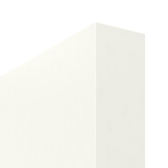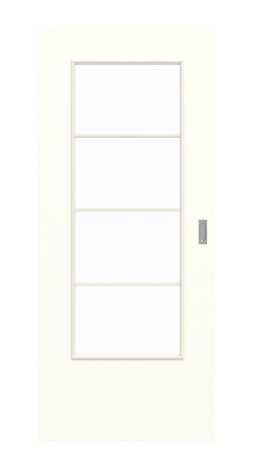 Szklany wstawka pośrodku skrzydła drzwiowego zapewnia jasny i przyjazny klimat wnętrza. Jest harmonijnie podzielony poziomymi prętami. Drzwi przesuwne w ponadczasowej bieli urzekają swoim minimalistycznym wyglądem. Matowa faktura nadaje projektowi eleganckie wykończenie. Światło, wysoka temperatura i ścieranie mechaniczne nie są w stanie uszkodzić wytrzymałej warstwy wierzchniej z HPL.