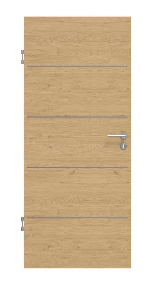 W równych odstępach skrzydło drzwiowe przecinają cztery eleganckie lizeny . Wzdłużne usłojenia z pojedynczymi śladami po sękach nadają pięknej dekoracji Authentic dąb szypułkowy naturalny wygląd drewna. Powłoka CPL zachwyca swoją odpornością na zabrudzenia i wysoką temperaturę. Są łatwe w czyszczeniu i odporne na uderzenia i zarysowania.