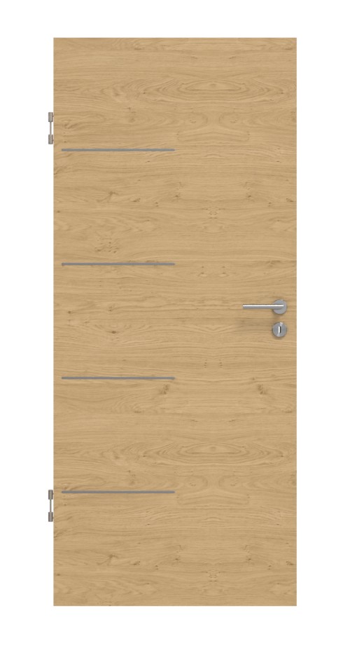 Po stronie zawiasów cztery eleganckie lizeny zdobią skrzydło drzwiowe. Przytulny wygląd drewna dekoru Authentic Asteiche zyskuje nowoczesny charakter dzięki wzdłużnemu przebiegowi słojów. Nowoczesny komfort pielęgnacji oraz wysoka odporność na zarysowania i uderzenia to dodatkowe cechy charakterystyczne powierzchni CPL.