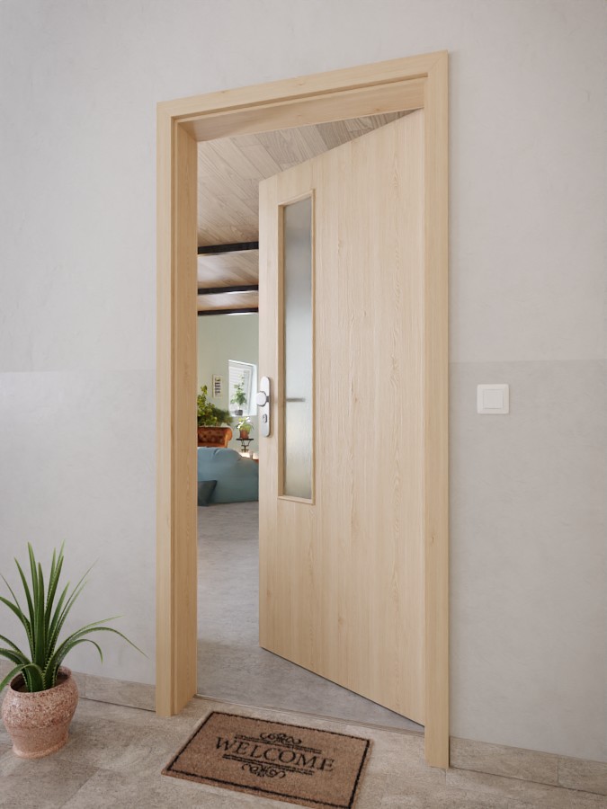 Po stronie zamka drzwi znajduje się wąskie przeszklenie. Delikatne słoje tworzą spokojny wzór drewna na dekorze Authentic Achat. Model pokryty powłoką HPL jest odporny na zarysowania, uderzenia i czynniki środowiskowe.