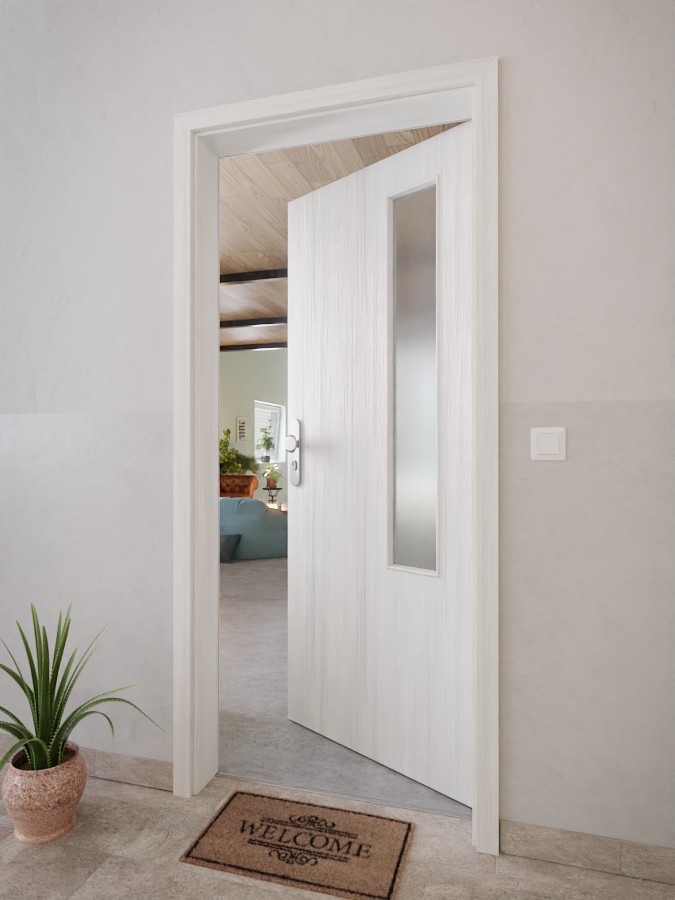 Prostokątny otwór świetlny po stronie zawiasów drzwi nadaje modny akcent. Rozciąga się w górnych dwóch trzecich drzwi. Jasny i nowoczesny prezentuje się dekor w kolorze białoszarym Authentic Grigio. Model pokryty HPL jest odporny na ciepło, uderzenia i wilgoć.