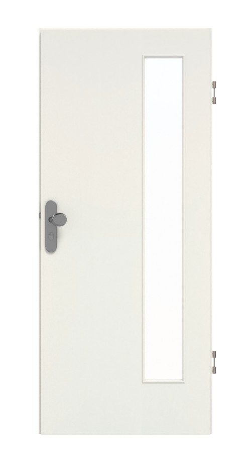 Strona zawiasowa skrzydła drzwiowego jest ozdobiona wąskim wycięciem na szybę . Dekor Biały strukturalny harmonijnie komponuje się z wystrojem wnętrza. Wytrzymała warstwa wierzchnia HPL przekonuje swoją odpornością na zarysowania, uderzenia, wysoką temperaturę i wilgoć.