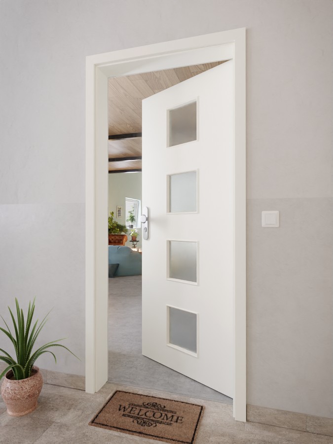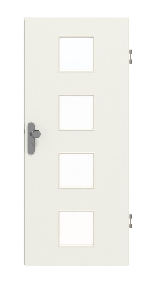 Środek skrzydła drzwiowego charakteryzuje się czterema identycznymi kwadratowymi wycięciami na szybę, które zapewniają ciekawy efekt świetlny. Dzięki biało-szarej kolorystyce dekor ten spokojnie komponuje się z każdym otoczeniem. Model pokryty powłoką HPL charakteryzuje się łatwością pielęgnacji, a także wysoką odpornością na uderzenia, zarysowania, wysoką temperaturę i wilgoć.