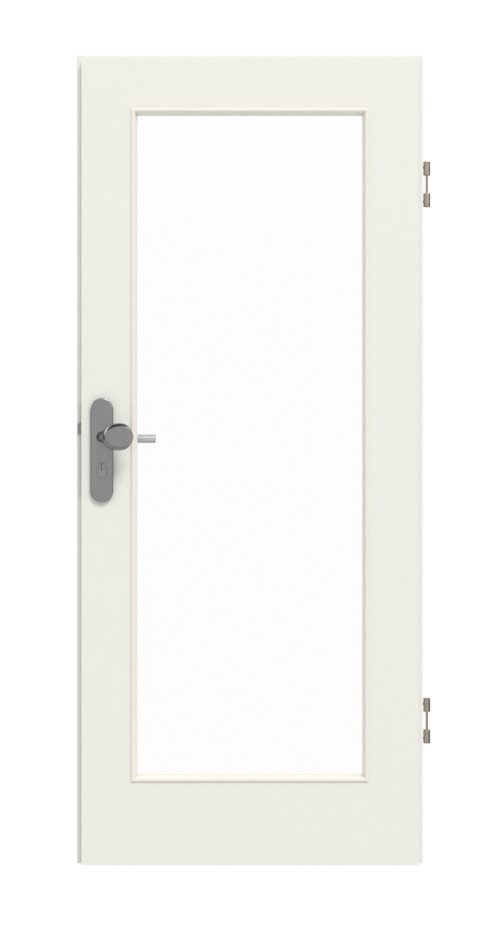 Skrzydło drzwiowe zdobi duże przeszklenie. Prostokąt jest otoczony listwami przyszybowymi. Odcień Rain to nowoczesna i subtelna mieszanka kolorów szarych i białych. Doskonale pasuje do każdego wnętrza. Odporna na zarysowania i uderzenia powierzchnia HPL pozwala w mgnieniu oka usunąć codzienne zabrudzenia.