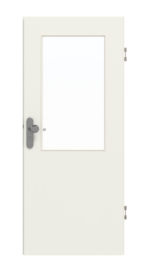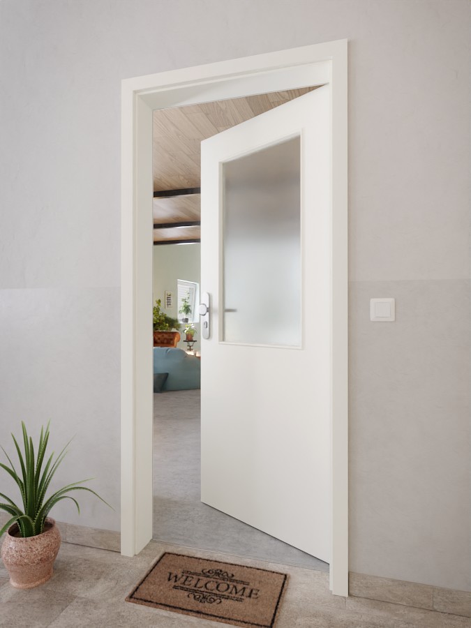 Skrzydło drzwiowe, zawiasy, zamek cylindryczny, szklenie, obniżona uszczelka podłogowa