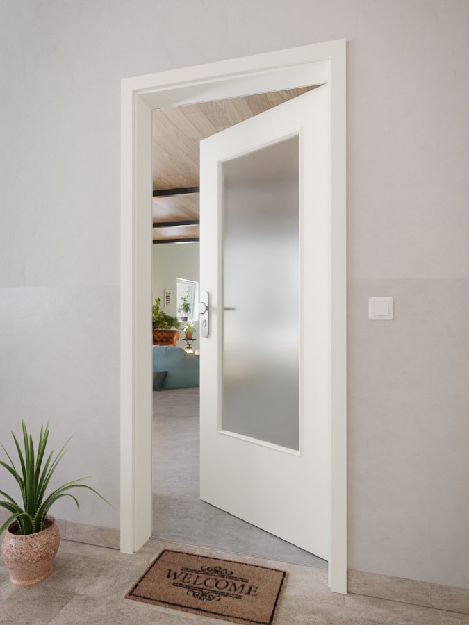 Skrzydło drzwiowe, zawiasy, zamek cylindryczny, szklenie, obniżona uszczelka podłogowa