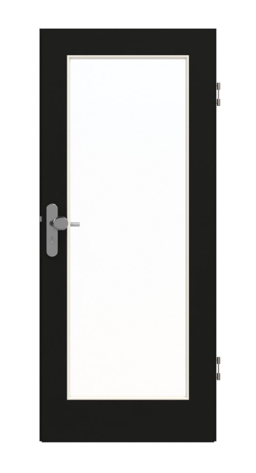Duże wycięcie na szybę w kształcie prostokąta zdobi skrzydło drzwiowe i zapewnia dodatkowe światło w pomieszczeniu. Modnym elementem przyciągającym wzrok jest czarna powierzchnia. Ciemny odcień fascynuje swoim eleganckim wyglądem. Powierzchnia paneli laminowanych wysokociśnieniowych nie tylko posiada atrakcyjne wykończenie wizualne, ale jest również wyjątkowo odporna na niepożądane zarysowania lub uderzenia.