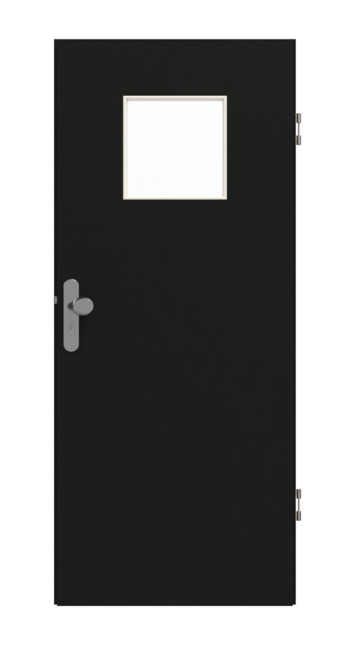 Na skrzydle drzwiowym osadzone jest kwadratowe wycięcie na szybę. Ma długość krawędzi 35 cm. Elegancki czarny dekor doskonale komponuje się z nowoczesnym wystrojem wnętrz. Gładka i zamknięta powierzchnia drzwi HPL ułatwia czyszczenie.