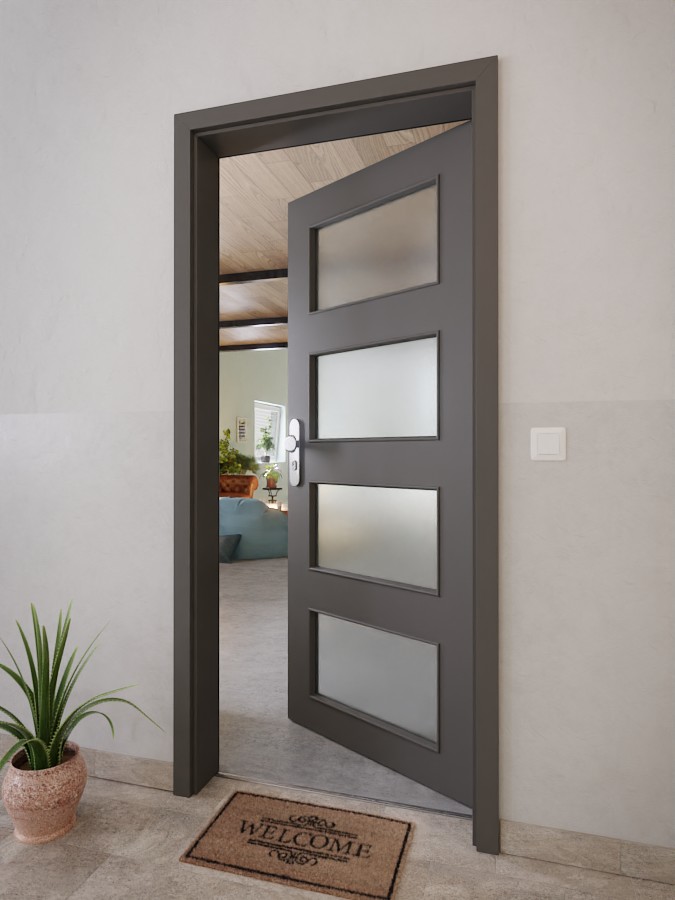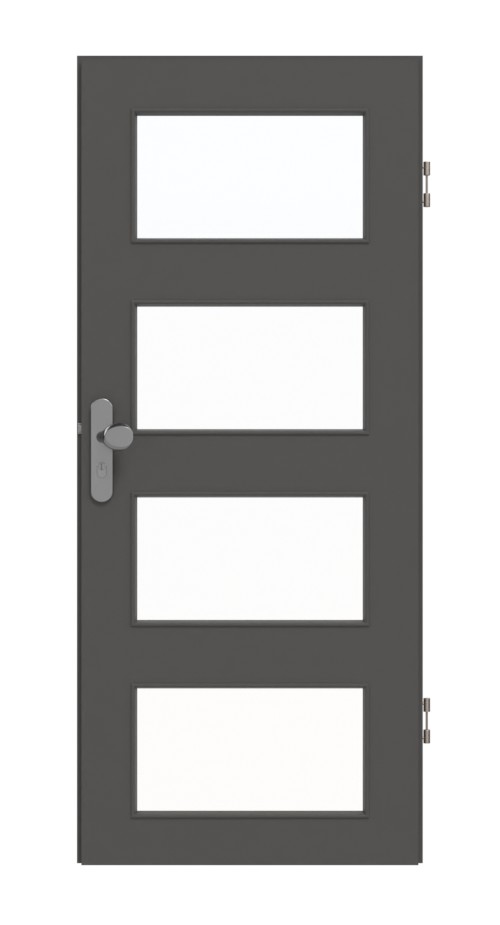 Skrzydło drzwiowe wygląda wyjątkowo i nowocześnie dzięki czterem wycentrowanym prostokątnym wycięciom na szybę. Dzięki drobno perłowej powierzchni, intensywnie szary dekor Ebony zapewnia przyjemne wrażenia dotykowe. Dzięki warstwie wierzchniej z CPL nie musisz martwić się o zarysowania, uderzenia i promieniowanie UV.