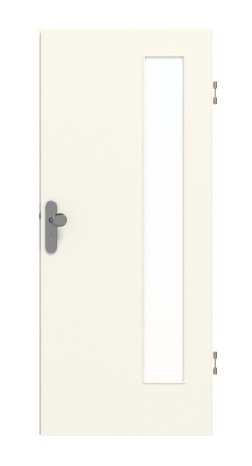 Prostokątne przeszklenie po stronie zawiasów sprawia, że skrzydło drzwiowe wygląda na lżejsze. Dzięki odcieniowi białemu Snow White model ten harmonijnie komponuje się z każdym wnętrzem. Perłowa struktura jest delikatna w dotyku. Zarysowania, uderzenia i promieniowanie UV nie mają wpływu na wytrzymałą powierzchnię CPL.