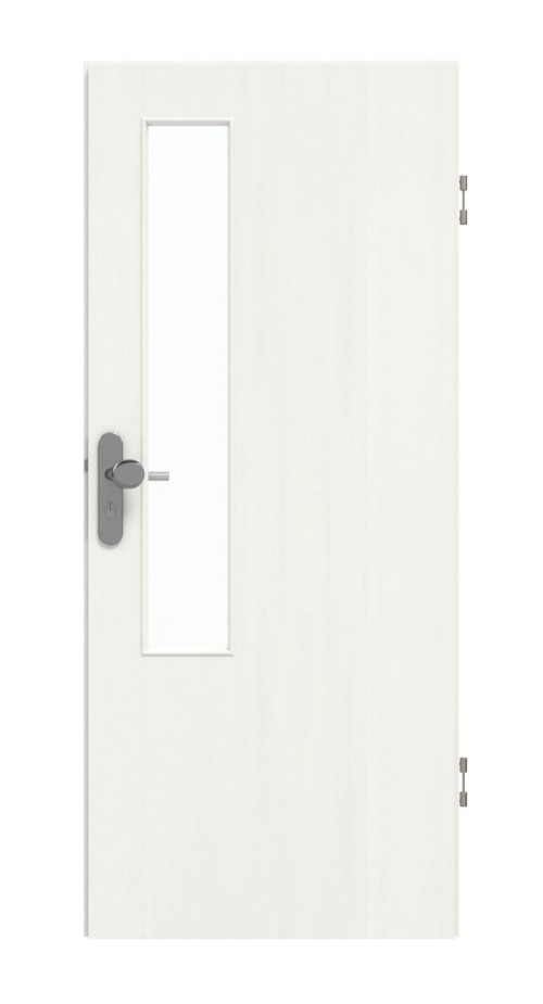 Od strony zamku rozciąga się prostokątny otwór o szerokości około 20 cm. Wystrój w białym odcieniu i z podłużnym usłojeniem sprawia wrażenie świeżego i nowoczesnego. Dzięki powłoce z CPL skrzydło drzwiowe jest odporne na czynniki mechaniczne i promieniowanie UV.