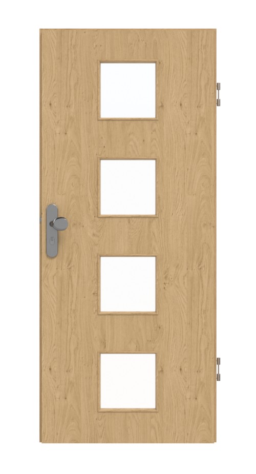 Nowoczesny design zawdzięcza swój charakter czterem kwadratowym przeszkleniom, które są ułożone jedno nad drugim pośrodku skrzydła drzwi. Dzięki realistycznemu wzorowi dekor Authentic Asteiche stanowi przekonującą alternatywę dla prawdziwego drewna. Odporna na zarysowania i uderzenia powierzchnia HPL pozwala w mgnieniu oka usunąć codzienne zabrudzenia.