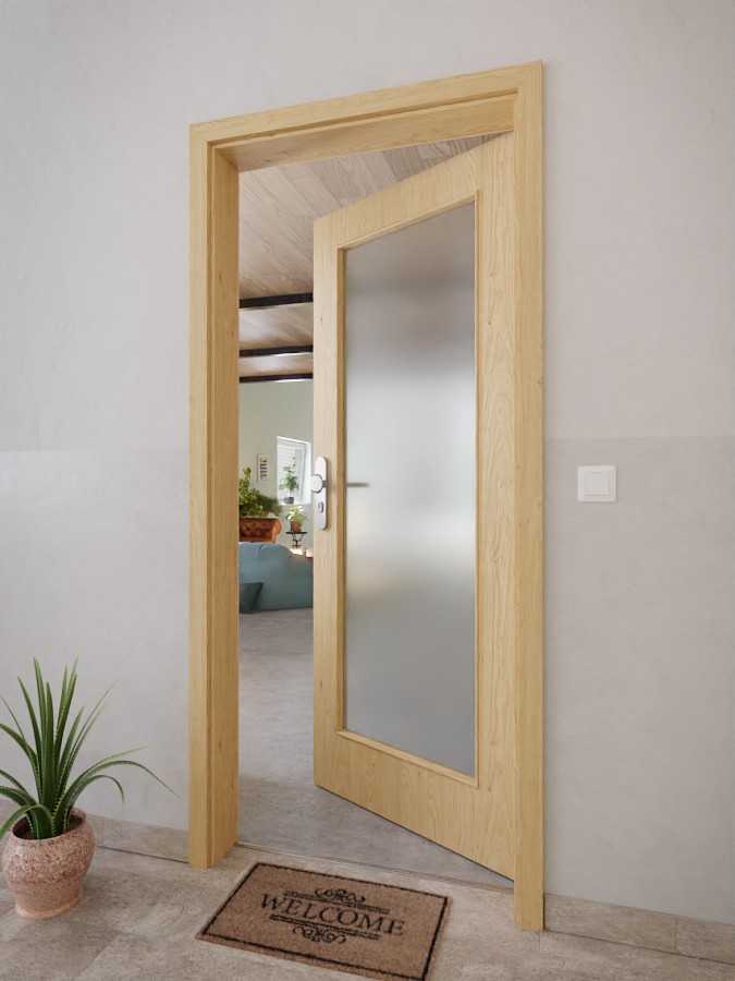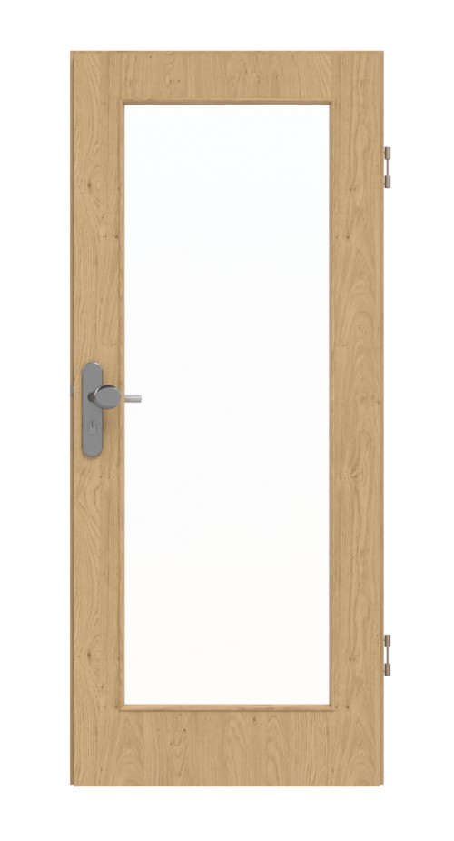 Jasność w pomieszczeniu zapewnia duży otwór świetlny, który stanowi centralny element skrzydła drzwi. Dzięki dynamicznym słojom dekor Authentic Asteiche tworzy niezwykle realistyczny wzór przypominający drewno. Model pokryty powłoką HPL charakteryzuje się łatwością pielęgnacji, a także wysoką odpornością na uderzenia, zarysowania, wysoką temperaturę i wilgoć.