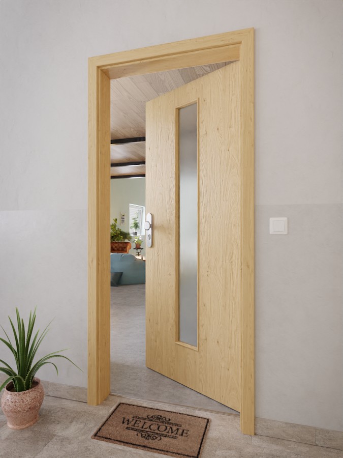 Środek skrzydła drzwiowego przecina wąski, prostokątny otwór . Na dekorze Authentic Asteiche widoczne są naturalne słoje drewna. Model jest odporny na zarysowania, uderzenia i promieniowanie UV dzięki wytrzymałej i łatwej w pielęgnacji powierzchni CPL.