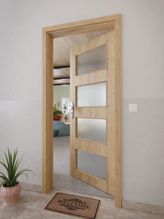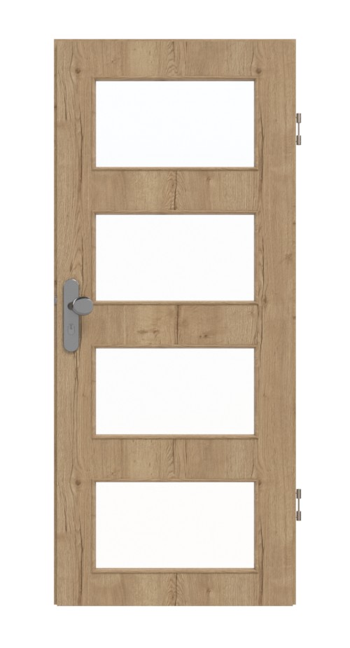 Skrzydło drzwiowe wygląda wyjątkowo i nowocześnie dzięki czterem wycentrowanym prostokątnym wycięciom na szybę. Ciemne usłojenia charakteryzują dekor drewna Authentic dąb szczelinowy. Dzięki naturalnemu wystrojowi wnętrz zapewnia rustykalny komfort. Ciepło, uderzenia i wilgoć nie mają wpływu na model pokryty płytą HPL.