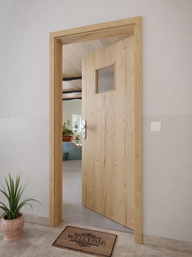 Górną część skrzydła drzwiowego zdobi kwadratowe przeszklenie o szerokości 30 cm. Naturalne słoje drewna zdobią rustykalny dekor Authentic dąb szczelinowy DA i zapewniają wyraziste wykończenie wizualne. Odporność na uderzenia, zarysowania, wysoką temperaturę i wilgoć oraz łatwość pielęgnacji – powłoka HPL zachwyca wieloma zaletami.