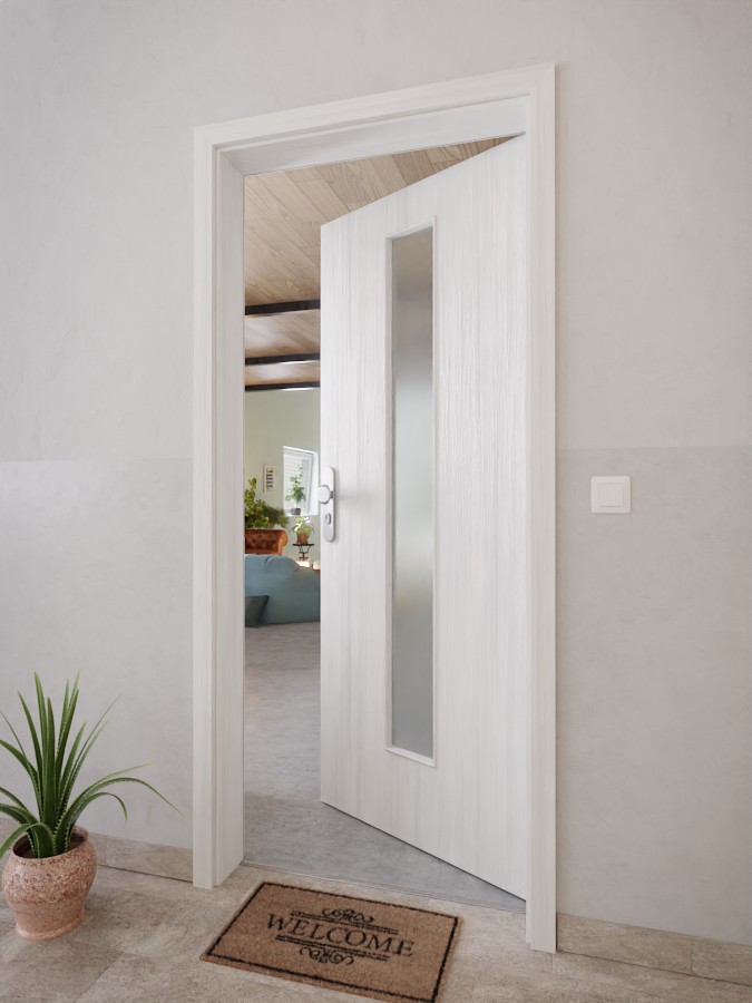 Środek skrzydła drzwi zdobi szeroki na około 20 cm świetlik z listwami szklanymi. Drewno przypominające jasnoszare usłojenie nadaje dekorowi Authentic Grigio nowoczesny akcent. Wysoka odporność na zarysowania i uderzenia oraz współczesny komfort pielęgnacji dodatkowo wyróżniają warstwę HPL.