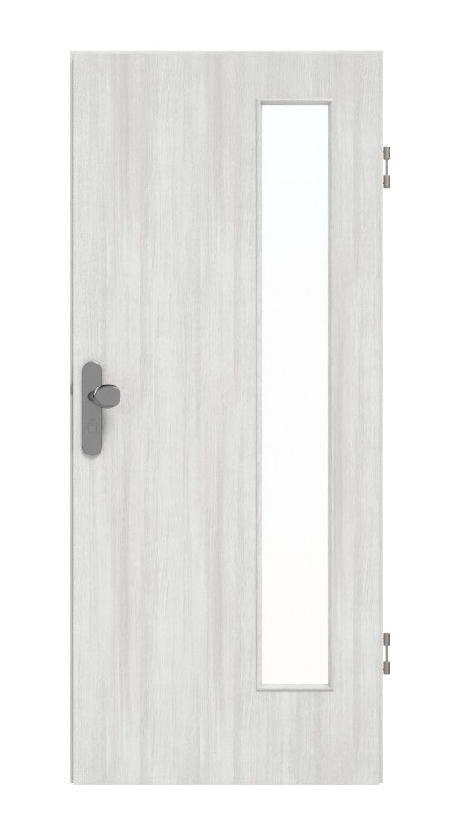 Wydłużony, wąski otwór świetlny po stronie zawiasów nadaje drzwiom nowoczesny charakter. Odświeżający odcień szarości z subtelnymi odcieniami rozciąga się wzdłuż skrzydła drzwi. Powłoka HPL zapewnia trwałość dzięki odporności na zarysowania, uderzenia, wysoką temperaturę i wilgoć.