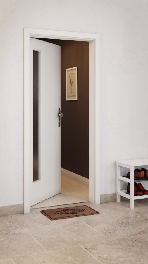 Po stronie zawiasów skrzydła drzwiowego znajduje się wąski wycięty fragment szyby . Harmonijny wygląd drzwi zawdzięcza się dekorowi „Biały strukturalny”. Oprócz łatwości w pielęgnacji, warstwa wierzchnia CPL charakteryzuje się odpornością na zarysowania, uderzenia i odpornością na UV.