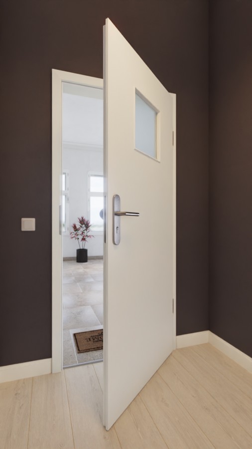 Najważniejszym elementem tego nowoczesnego projektu jest kwadratowy otwór na światło w górnej części skrzydła drzwi. Przyjemny dotyk wynika z lekkiej faktury wzoru Biały strukturalny Premium. Powierzchnie CPL zachowują swój piękny design nawet po długim użytkowaniu i pod wpływem promieniowania UV.
