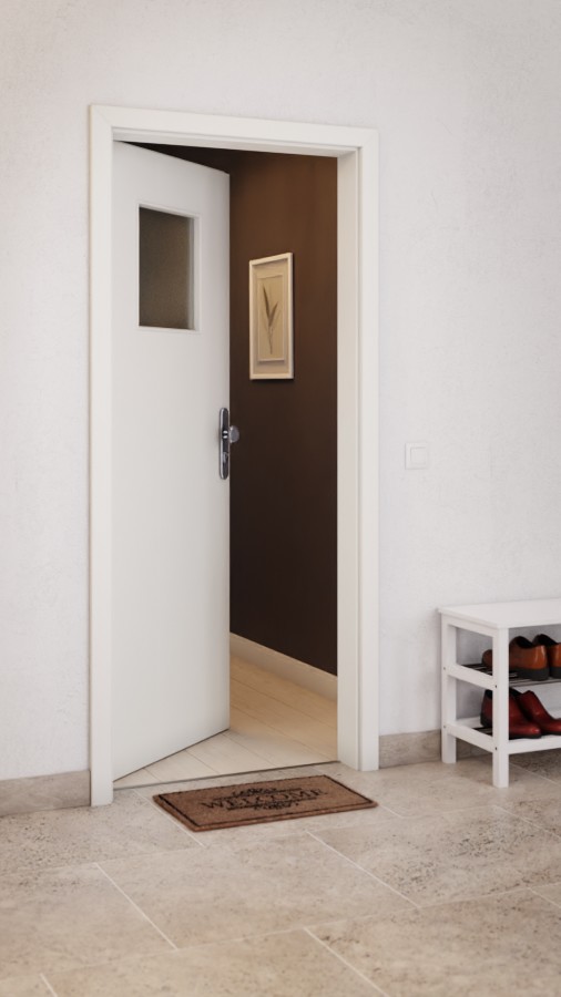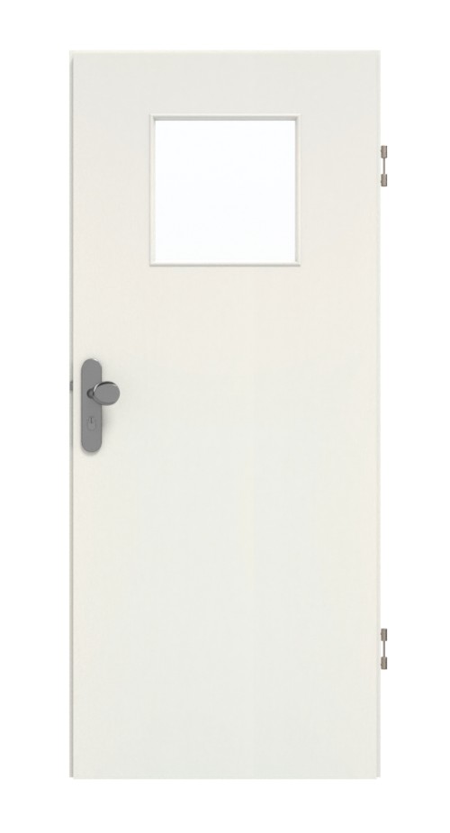 W górnej jednej trzeciej skrzydła drzwiowego na środku znajduje się kwadratowe przeszklenie o szerokości 40 cm. Przyjemny dotyk wynika z lekkiej faktury wzoru Biały Struktura Premium. Odporna powłoka CPL zapewnia odporność na zarysowania i uderzenia.