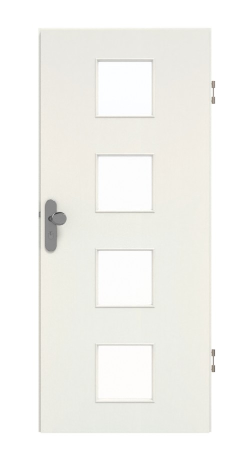 Cztery kwadratowe wycięcia na szybę są ułożone jeden nad drugim na środku skrzydła drzwiowego. W dekorze Biały strukturalny Premium łączy się świeży odcień bieli z wyczuwalną fakturą. Odporność na uderzenia, zarysowania, wysoką temperaturę i wilgoć oraz łatwość pielęgnacji – powłoka HPL zachwyca wieloma zaletami.