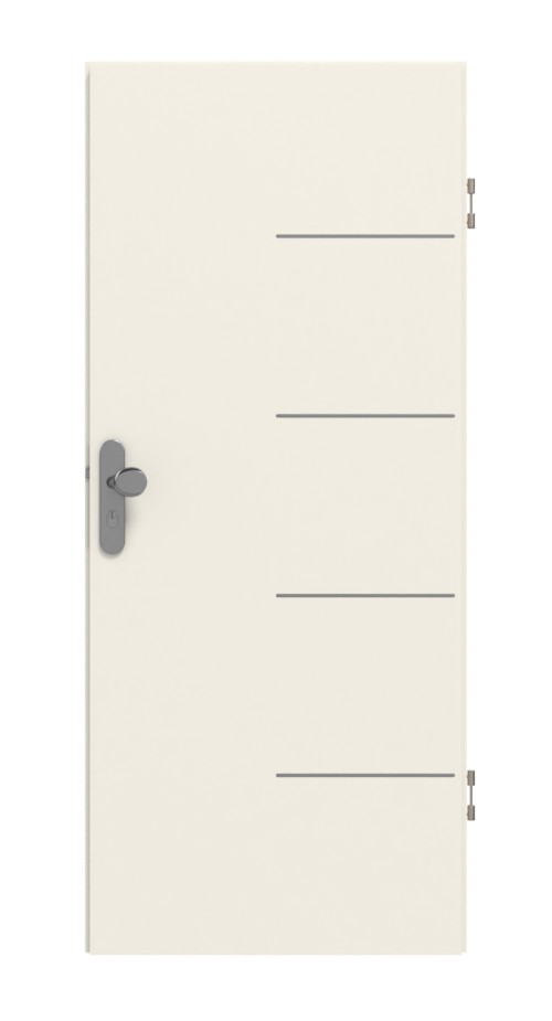 Cztery eleganckie listwy rozciągają się po stronie zawiasów do środka skrzydła drzwiowego. Dekor w kolorzebiałego lakieru 9010 jest jasny i łatwy do łączenia z innymi elementami. Łatwa w czyszczeniu powierzchnia CPL zachwyca nie tylko swoim wyglądem, ale także odpornością na uderzenia i zarysowania.