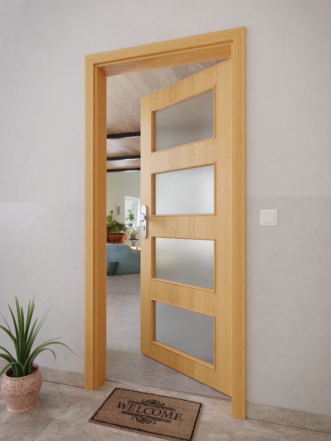 Nowoczesny wygląd drzwi uzyskuje się dzięki czterem prostokątnym przeszkleniom, które są umieszczone jeden nad drugim. Ciepły odcień drewna w dekorze dębowym Premium łączy się z autentycznymi słojami. Razem tworzą przekonujący obraz drewna, który zapewnia przytulność. Oprócz łatwej pielęgnacji, powłoka CPL wyróżnia się odpornością na zarysowania, uderzenia i promieniowanie UV.