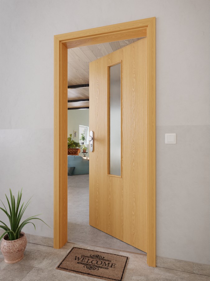 Prostokątny świetlik o szerokości około 20 cm przebiega przez środek skrzydła drzwi w górnej części. W grze delikatnych i wyraźniejszych słojów drewna powstaje autentyczny wygląd drewna dekoru dębowego Premium. Oprócz łatwej pielęgnacji, powłoka CPL wyróżnia się odpornością na zarysowania, uderzenia i promieniowanie UV.
