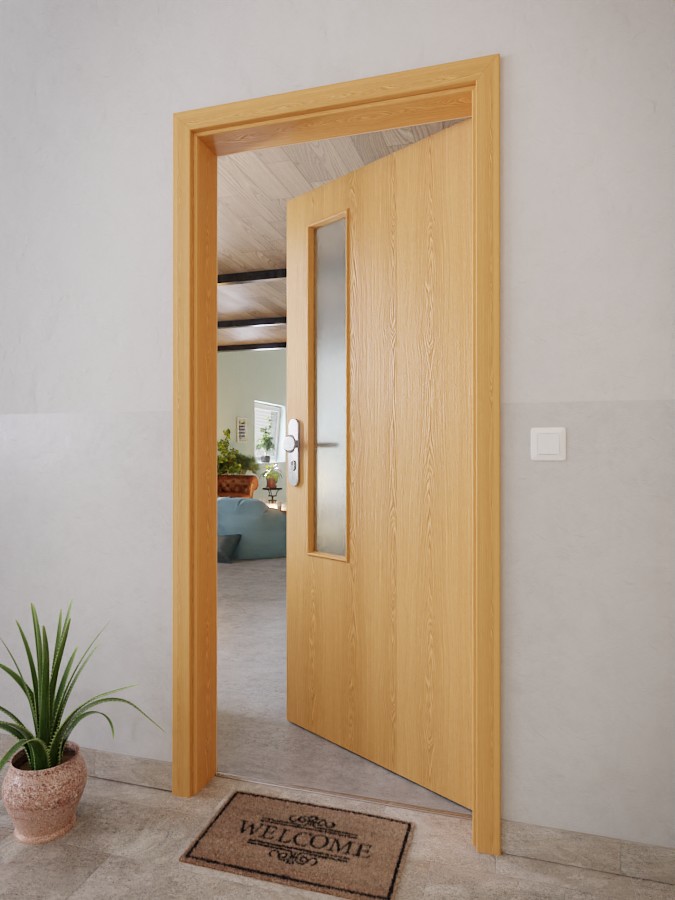 Po stronie zamka drzwi znajduje się wąskie okno. Delikatne linie rysują autentyczny rysunek drewna na naturalnym brązowym dekorze dębu Premium. Powłoka CPL jest odporna, odporna na ścieranie i łatwa w pielęgnacji.
