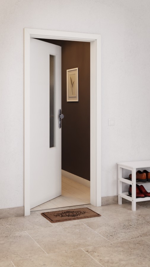 Nowoczesny akcent stanowi wąskie, prostokątne wycięcie na szybę po stronie zamka na skrzydle drzwiowym. Powściągliwe usłojenie w układzie poprzecznym zdobi biały dekor Authentic Bianco. Powłoka z CPL jest wytrzymała, odporna na ścieranie i łatwa w pielęgnacji.
