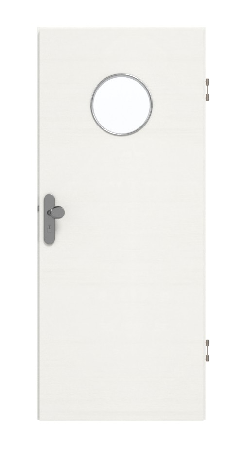 Światło wpada do pomieszczenia przez umieszczony pośrodku bulaj w górnej części drzwi. Zintegrowany biały dekor Quer Authentic Bianco doskonale komponuje się z niemal każdym stylem wnętrza. Odporność na uderzenia, zarysowania, wysoką temperaturę i wilgoć oraz łatwość pielęgnacji – powłoka HPL zachwyca wieloma zaletami.