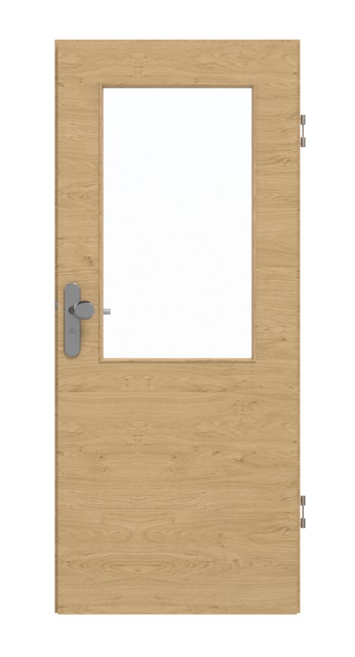 Skrzydło drzwiowe, zawiasy, zamek cylindryczny, szklenie, obniżona uszczelka podłogowa