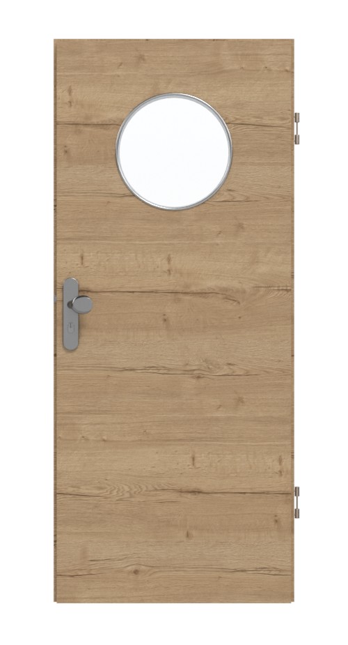 Umieszczony pośrodku górnej części drzwi bulaj przyciąga wzrok. Ma średnicę 40 cm i jest otoczony listwami przyszybowymi ze stali nierdzewnej. Poprzecznie przebiegające słoje drewna nadają dekorowi Quer Authentic Risseiche nowoczesny wygląd. Odporność na uderzenia, zarysowania, wysoką temperaturę i wilgoć oraz łatwość pielęgnacji – powłoka HPL zachwyca wieloma zaletami.