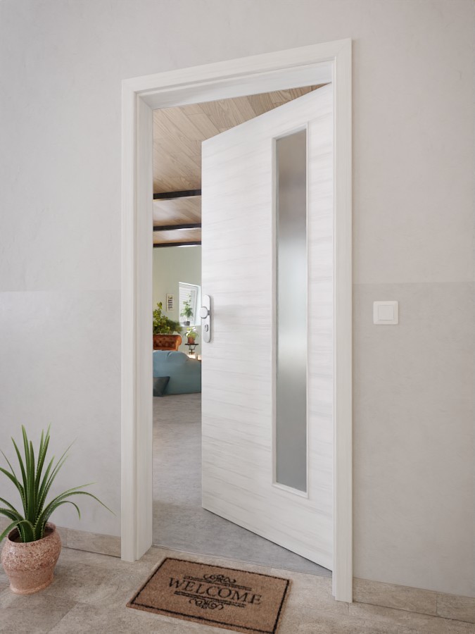 Po stronie zawiasów skrzydło drzwiowe zdobi wąskie wycięcie na szybę. Delikatna biel i jasna szarość łączą się w dekorze Authentic Grigio, tworząc nowoczesny wygląd drewna. Model pokryty powłoką HPL charakteryzuje się łatwością pielęgnacji, a także wysoką odpornością na uderzenia, zarysowania, wysoką temperaturę i wilgoć.