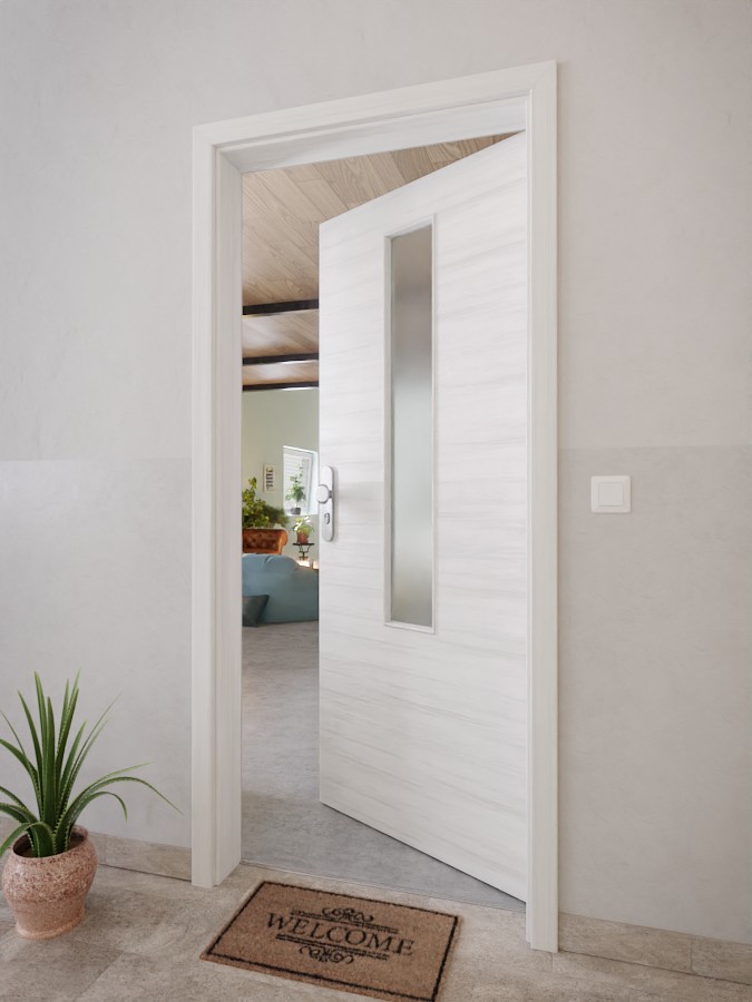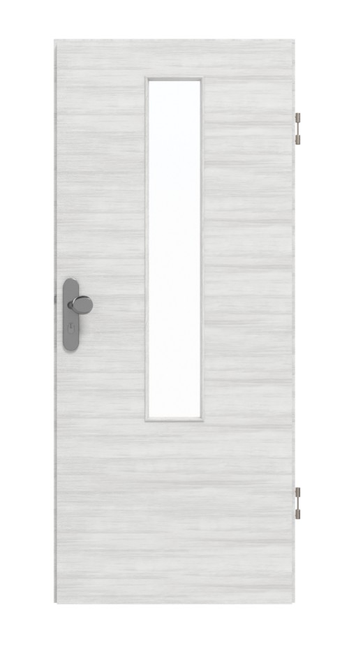Centralnym elementem designu jest krótkie, smukłe przeszklenie w górnej części drzwi. Na białym tle przebiegają jasnoszare usłojenia w układzie poprzecznym. Powierzchnia paneli laminowanych wysokociśnieniowych nie tylko posiada atrakcyjne wykończenie wizualne, ale jest również wyjątkowo odporna na niepożądane zarysowania lub uderzenia.
