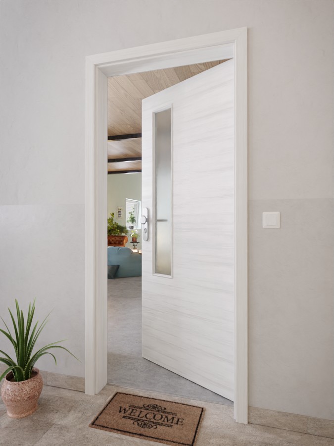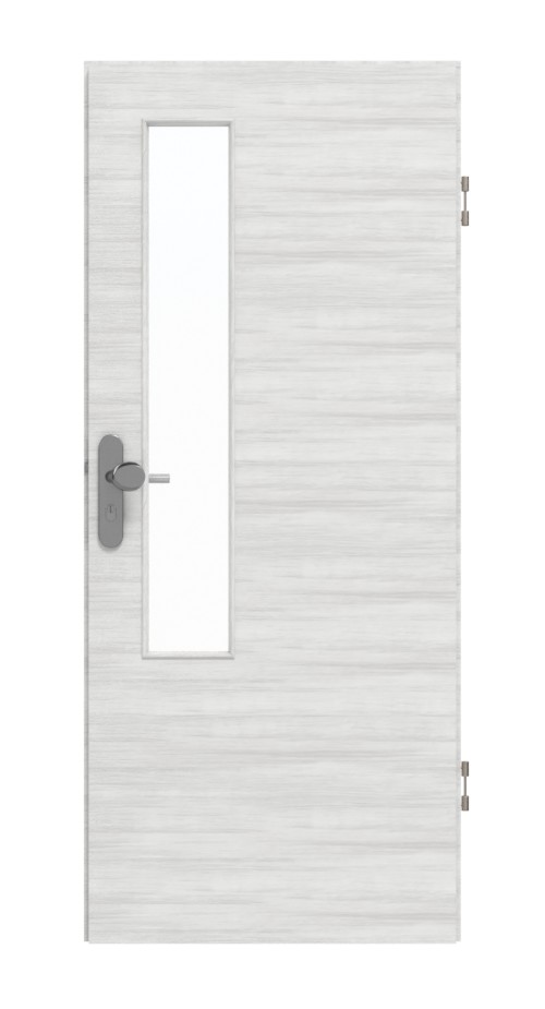 Najważniejszym elementem nowoczesnego designu jest wąskie przeszklenie po stronie zamka. Na białym tle przebiegają jasnoszare usłojenia w układzie poprzecznym. Ciepło, uderzenia i wilgoć nie mają wpływu na model pokryty płytą HPL.