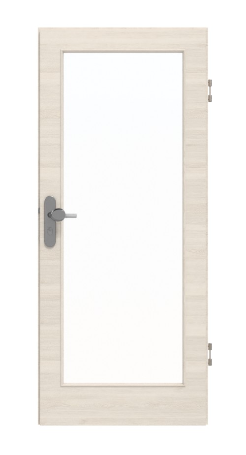 Prostokątne wycięcie na szybę, które zajmuje większość powierzchni skrzydła drzwiowego, zapewnia dużą ilość światła w pomieszczeniu. Modny i harmonijny wzór dekoru poprzecznego Authentic Perl charakteryzuje się jasnym wyglądem drewna. Gładka i zamknięta powierzchnia drzwi HPL ułatwia czyszczenie.