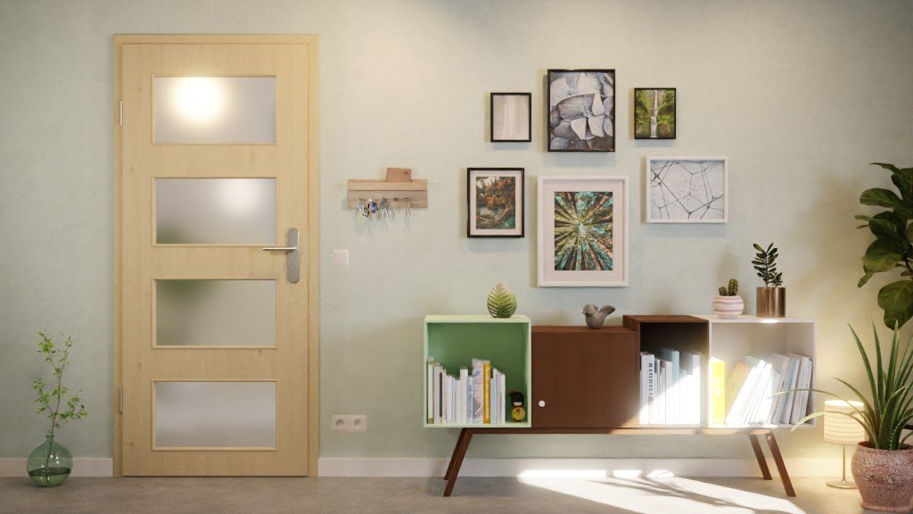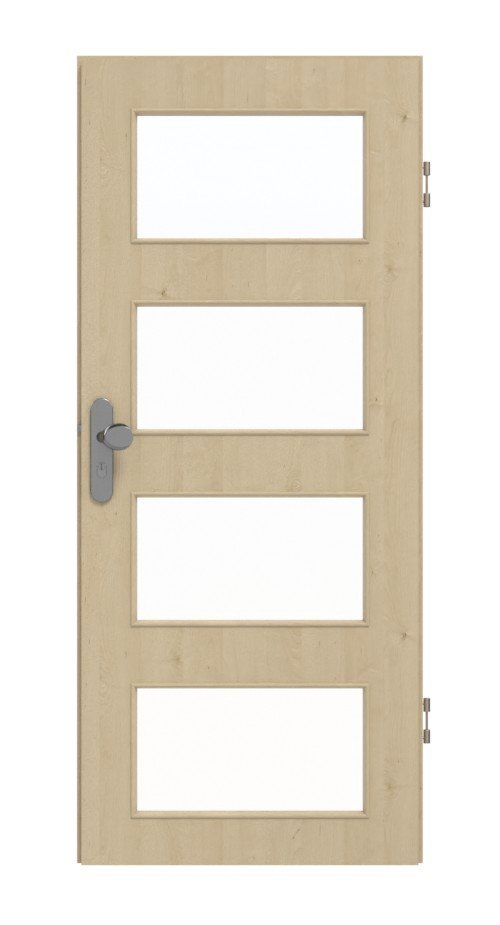 W środkowej części skrzydła drzwiowego znajduje się rząd czterech prostokątnych przeszkleń. Delikatne usłojenia z delikatnymi sękami rozciągają się wzdłuż pięknego dekoru Natura Ahorn. Powłoka z CPL jest wytrzymała, odporna na ścieranie i łatwa w pielęgnacji.